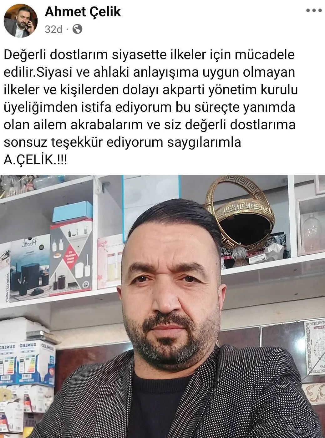 AK Parti Nizip İlçe Yönetim Kurulu Üyesi Ahmet Çelik, sosyal medya hesabından yaptığı açıklamayla istifasını kamuoyuna açıkladı.
