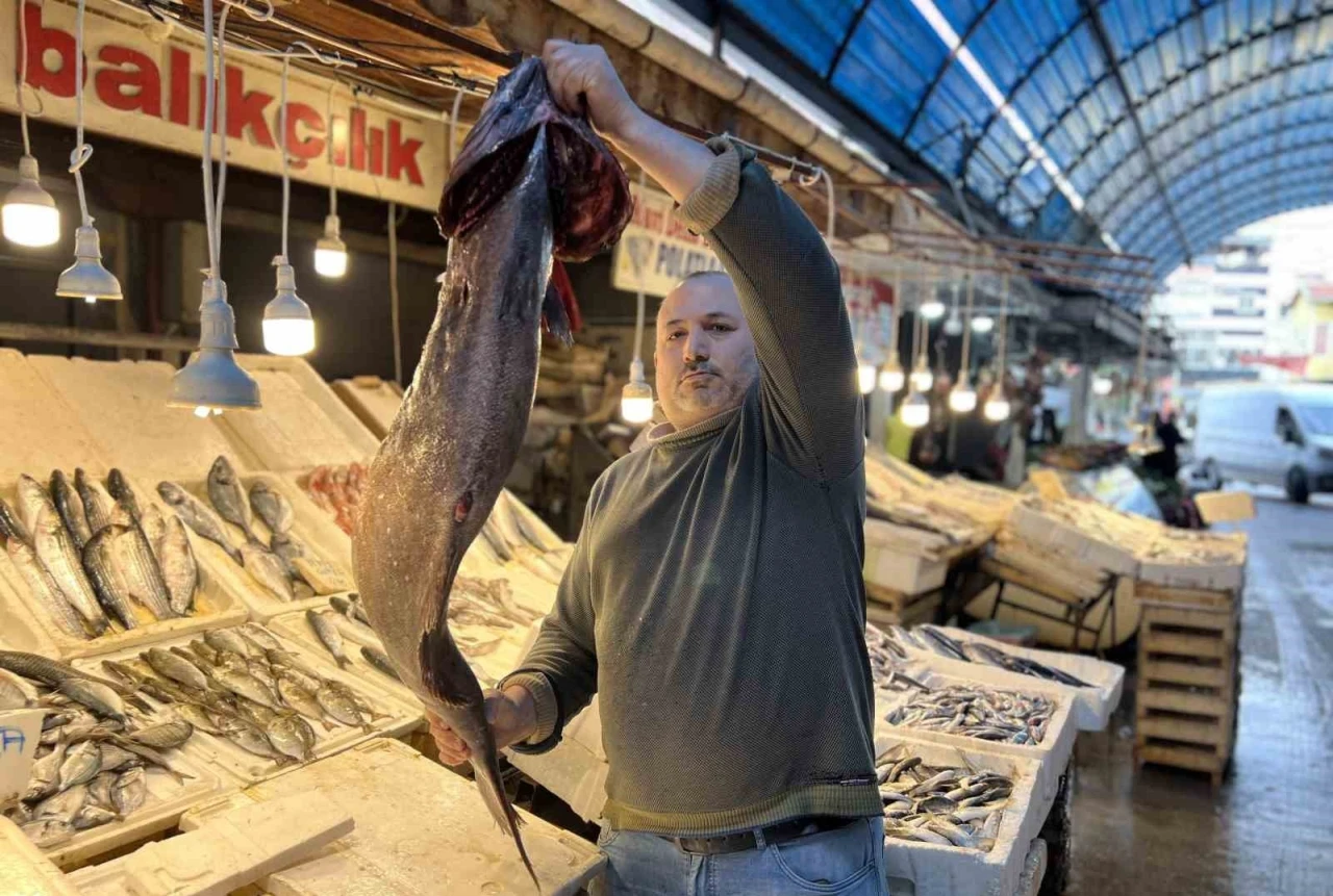 Mersin’de Akdeniz’de nadir görülen yaklaşık 1,5 metre boyunda, 25 kilogram ağırlığındaki ’Atlas balığı’ yakalanarak tezgahta sergilendi.