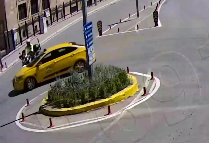 Amasya’da motosikletli polisin ticari taksiyle çarptığı kazada polis memuru yaralandı. Kaza anı güvenlik kamerasına yansıdı.
