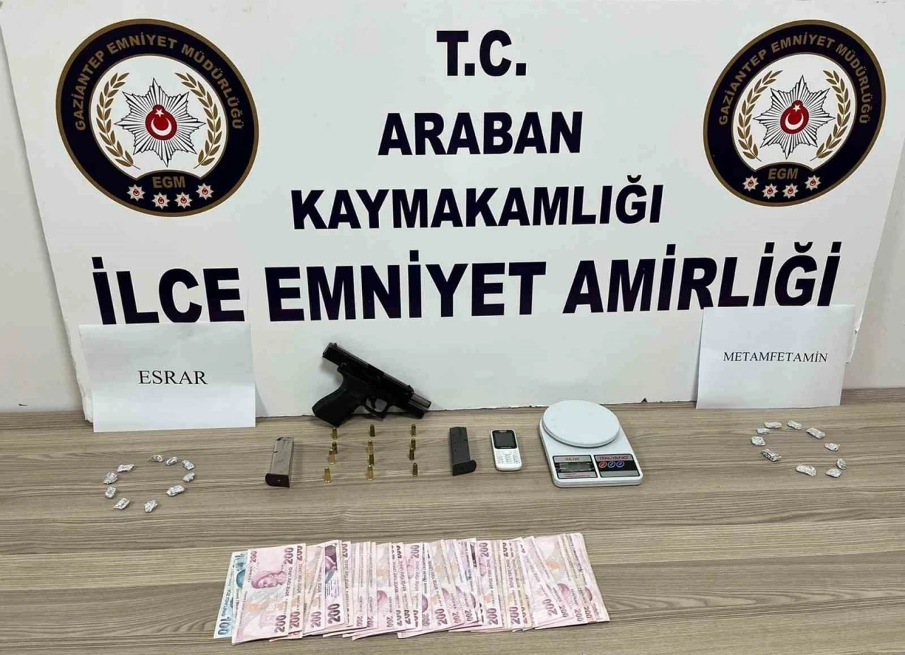 Gaziantep Emniyet Müdürlüğü’ne bağlı Araban İlçe Emniyet Amirliği ekipleri, uyuşturucu operasyonu yaptı. Operasyon sonucunda 1 şüpheli gözaltına alınırken yapılan aramalarda ise 1 adet ruhsatsız tabanca, 12 adet fişek, 2 adet şarjör, 1 adet hassas terazi ve bir miktar uyuşturucu madde ele geçirildi.