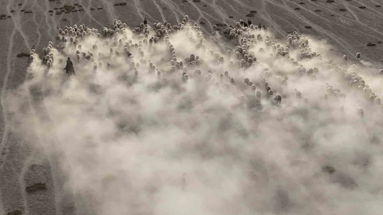 Gün batımına doğru dron ile kaydedilen görüntülerde sürünün ilerleyişi adeta bir tabloyu andırdı. Koyunlar, nizami bir şekilde sıralanarak ağıllarına doğru ilerlerken, oluşan toz bulutlarıyla birlikte görsel bir şölen sundu. Çobanın telaşı da kimi zaman sürünün kimi zaman sürünün yanında görüntülere yansıdı.