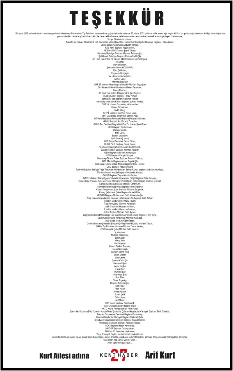18 Mayıs 2023 tarihinde beyin kanaması geçirerek Gaziantep Üniversitesi Tıp Fakültesi Hastanesinde yoğun bakımda yatan ve 25 Mayıs 2023 tarhinde vefat eden, ağa beyim Ali Kurt’un gerek yoğun bakımda kaldığı sürece ilgileriyle yanımızda olan Hastane yönetimi ve doktor ile personel kadrosuna. vefatından sonra cenazemize katılarak acımızı paylaşan dostlarımıza,