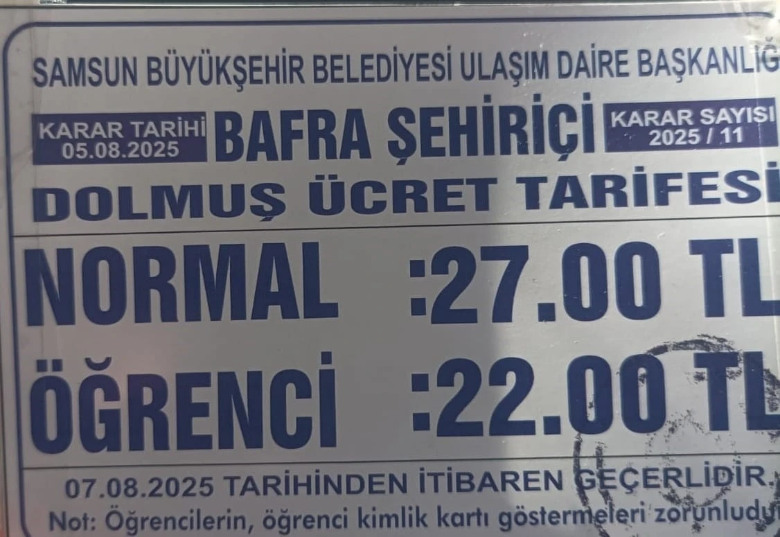 Samsun’un Bafra ilçesinde, UKOME tarafından alınan kararla şehir içi dolmuş ücretlerine zam yapıldı. Yeni tarifeye göre, tam yolcu ücreti 27 TL, öğrenci ücreti ise 22 TL olarak belirlendi.