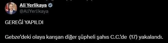 İçişleri Bakanı Ali Yerlikaya, "Gebze’deki olaya karışan diğer şüpheli şahıs C.C. de (17) yakalandı" dedi.