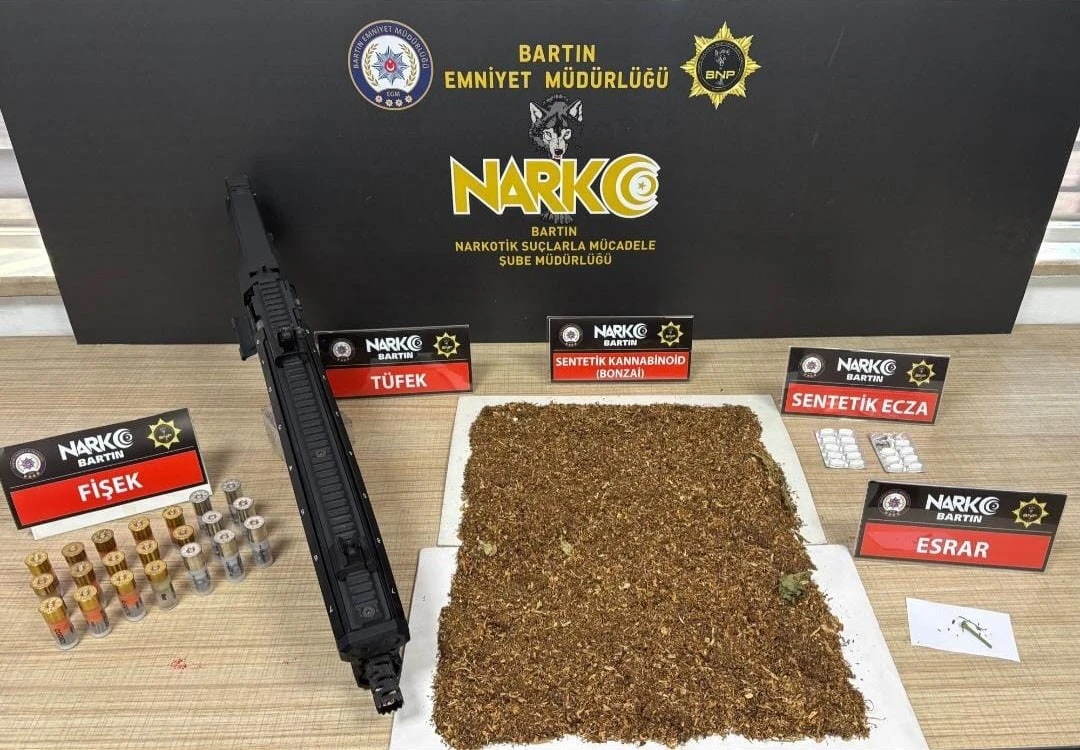 Bartın Emniyet Müdürlüğü Narkotik Suçlarla Mücadele Şube Müdürlüğü ekiplerince savcılık koordinesinde yapılan operasyonda 6 şahıs yakalanarak gözaltına alınmış, şahısların ikametlerinde yapılan aramalarda ise 449,55 gram sentetik kannabinoid (bonzai) maddesi, 2,89 gram esrar, 17 adet sentetik ecza, 1 adet pompalı tüfek ele geçirilmişti.