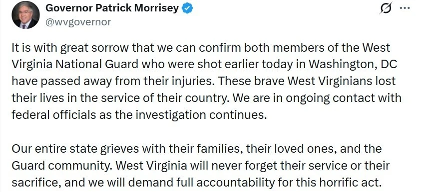 ABD’nin başkenti Washington D.C’deki Beyaz Saray yakınlarında 2 Ulusal Muhafız personeline yönelik gerçekleştirilen silahlı saldırının bilançosu netleşti. West Virginia Valisi Patrick Morrisey, sosyal medya platformu X üzerinden yaptığı açıklamada, erken saatlerde silahlı saldırıya uğrayan West Virginia Ulusal Muhafızları’nın 2 üyesinin de hayatını kaybettiğini belirterek, "Bu cesur West Virginialılar, ülkeleri uğruna canlarını verdiler. Soruşturma devam ederken federal yetkililerle sürekli iletişim halindeyiz" açıklamasında bulundu. Tüm West Virginia’nın saldırıya uğrayan Ulusal Muhafız personelinin aileleri, sevdikleri ve Ulusal Muhafızlar topluluğu ile birlikte yas tuttuğunu ifade eden Morrisey, "West Virginia, onların hizmetlerini ve fedakarlıklarını asla unutmayacak ve bu korkunç eylemin sorumlularının hesap vermesini sağlamak için çalışacağız" ifadelerini kullandı. Reagan Havalimanı’na inişler kısa süreliğine durduruldu