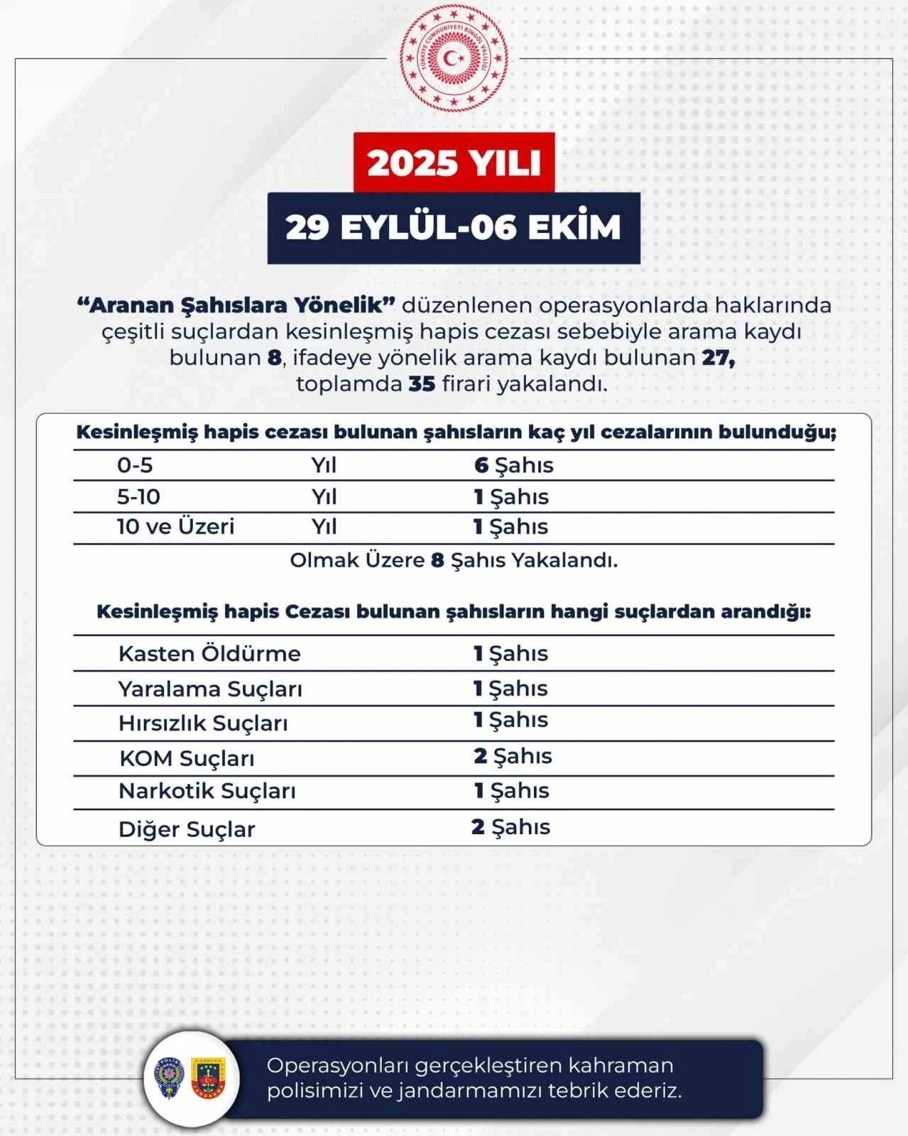 Bingöl’de son bir hafta içerisinde yapılan polis ve jandarma ekipleri tarafından yapılan çalışmada toplam 35 firari yakalandı. Bingöl’de güvenlik güçleri güvenlik ve asayişin sağlanması için kent genelinde çalışmalarını sürdürüyor. Bu çerçevede 29 Eylül-6 Ekim 2025 tarihleri arasında yapılan çalışmalarda 220 gram esrar, 13 gram metamfetamin, 5 gram kokain, 8 adet uyuşturucu hap, 1 adet tabanca ve şarjörü, 3 adet av tüfeği, 8 adet fişek, 205 paket kaçak sigara, 29 adet tarihi eser niteliğinde parça, 1 adet mühür ele geçirildi. Operasyonlarda 21 şüpheli gözaltına alındı. Bir hafta içinde toplam 69 bin 17 şahıs sorgulanırken aranan 41 şahsın tespit edildi. Ayrıca 16 bin 32 araç denetlenirken bin 415 araca cezai işlem uygulandığı ve 115 aracın trafikten men edildiği bildirildi.