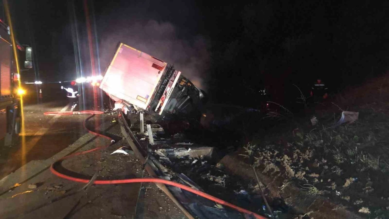 Bolu’da TEM Otoyolu’nda kontrolden çıkan tır, bariyerlere çarptı. Meydana gelen kaza sonrasında tır, dorsesiyle birlikte alev alev yandı.