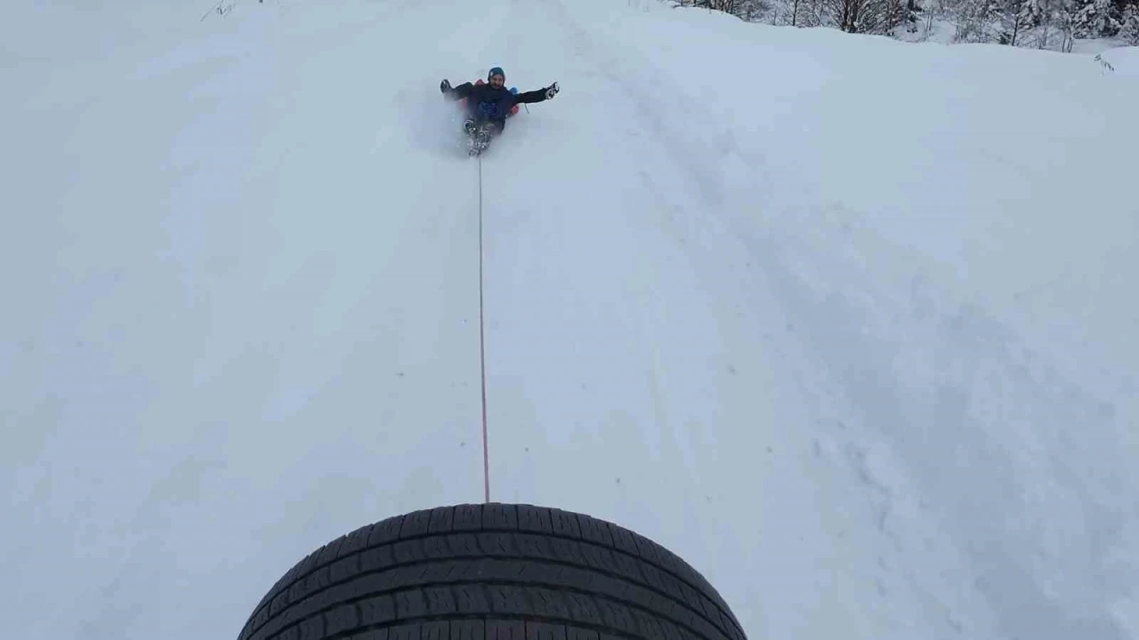 Rize’de şiddetli kar yağış kenti beyaza bürüdü. Yaylalarda 1 metreyi aşan kar fotoğraf tutkunlarına kartpostallık görüntüler verirken adrenalin tutkunlarına da keyifli dakikalar yaşattı. Adrenalin tutkunu Oğuz Bal ve Volkan Aytaç isimli 2 arkadaş, yağan karı fırsat bilerek Rize’nin İkizdere ilçesindeki Sivrikaya Yaylası’na çıktı. 4x4 araçlarının arkasına bir ip vasıtası ile branda bağlayan 2 kafadar, yanlarında bulunan diğer arkadaşlarından aracı sürmesini rica etti. Brandanın üzerinde oturan 2 kafadar arabanın da kendilerini çekmesiyle karda kayarak keyifli anlar yaşadı. Sürücü olan arkadaşlarına ’biraz yavaş gitsene vicdansız’ diye seslenseler de bununla da yetinmeyen ikili bu kez brandanın üzerinde ayağa kalktı. Ayakta da kaymayı başaran Aytaç ve Bal’ın o anları renkli görüntülere sahne oldu.