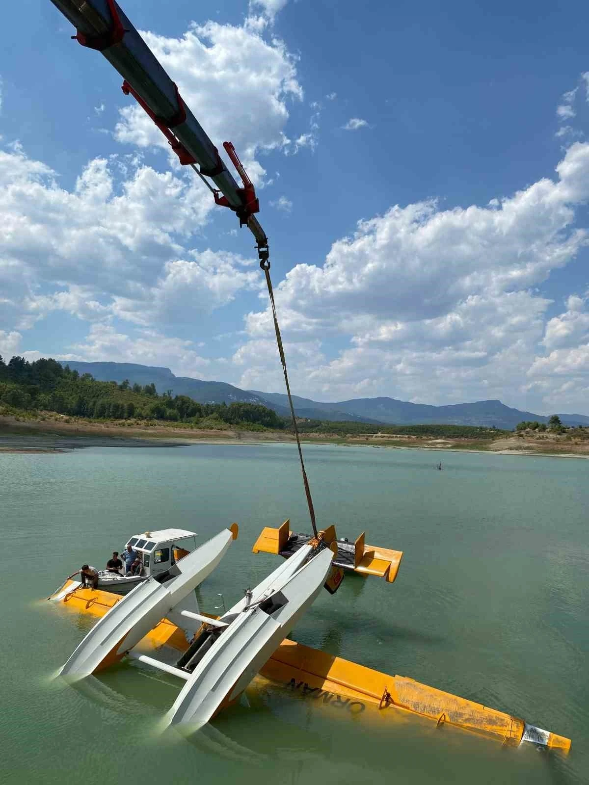 Burdur’da barajdan su almak için deneme uçuşu yaptığı sırada kaza kırıma uğrayıp ters dönen uçak vinç yardımıyla bulunduğu yerden çıkarıldı.