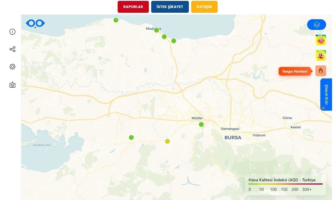 Bursa büyükşehir belediyesi, hava ve gürültü kirliliğinin tespiti için geçtiğimiz aylarda devreye aldığı hava kalitesi izleme sistemine yangın izleme sistemini de entegre etti. Bursa’daki ve türkiye’deki tüm yangın noktalarını anlık olarak gösteren sistemi, büyükşehir belediyesi’nin internet sitesi üzerinden herkes kullanabilecek