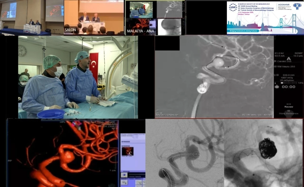 Toplantı kapsamında, İnönü Üniversitesi Turgut Özal Tıp Merkezi Girişimsel Nöroradyoloji Ünitesi’nden Prof. Dr. İsmail Okan Yıldırım ve Doç. Dr. Ahmet Turan Kaya öncülüğündeki ekip, beyin damarlarında oluşan baloncukların (anevrizma) kapalı yöntemle tedavisini canlı yayında gerçekleştirdi. Ameliyata Beyin ve Sinir Cerrahisi Anabilim Dalı’ndan Doç. Dr. Bora Tetik de eşlik etti. Zorlu operasyon, dünyanın dört bir yanından gelen bilim insanları tarafından anbean takip edildi. Aynı anda iki ameliyat birden yapıldı