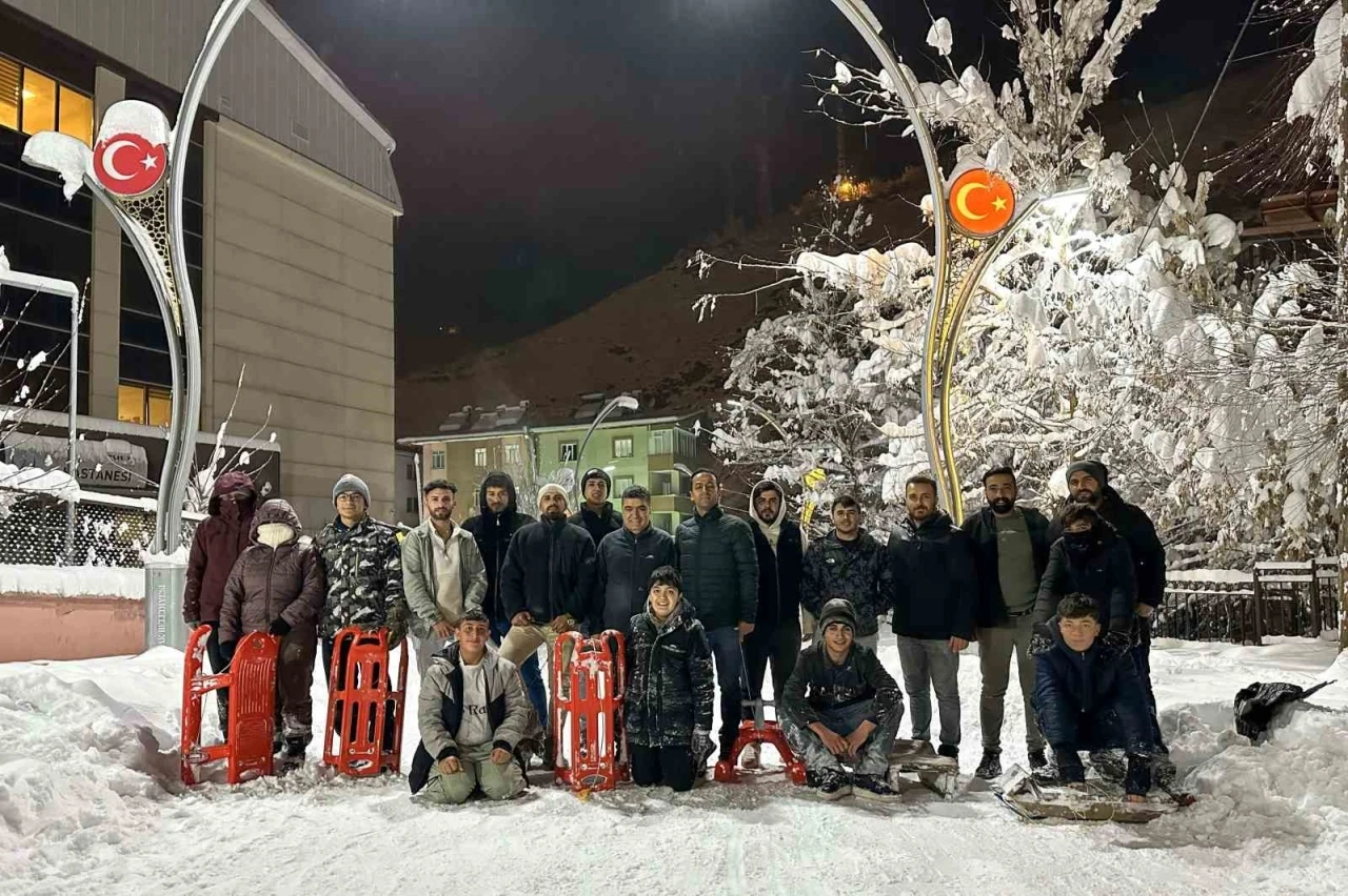 Van’ın Çatak ilçesinde etkili olan yoğun kar yağışı nedeniyle okulların il genelinde tatil edilmesini fırsata çeviren öğrenciler, kızaklarıyla gece geç saatlere kadar kayarak karın keyfini çıkardı.
