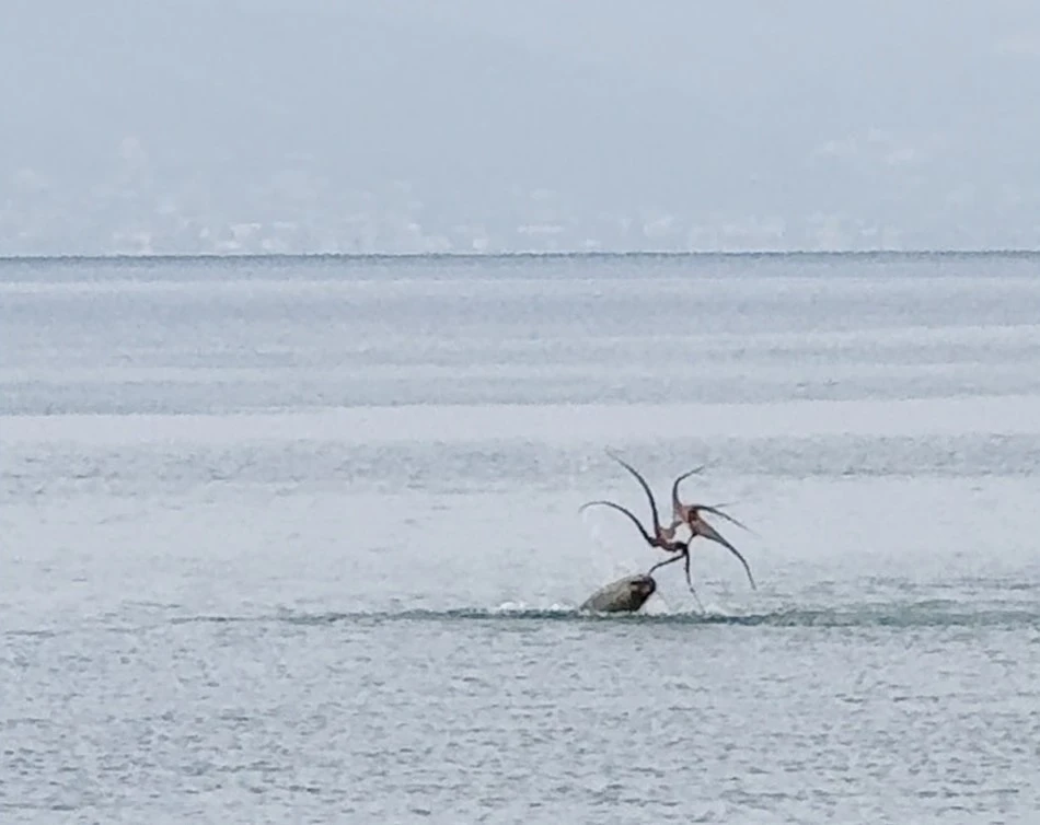 ?zmir'in çeşme ilçesinde sahile yakın bir noktada ahtapot avlayan akdeniz fokunun dakikalar süren mücadelesi, kıyıda izleyenleri şaşkına çevirdi.