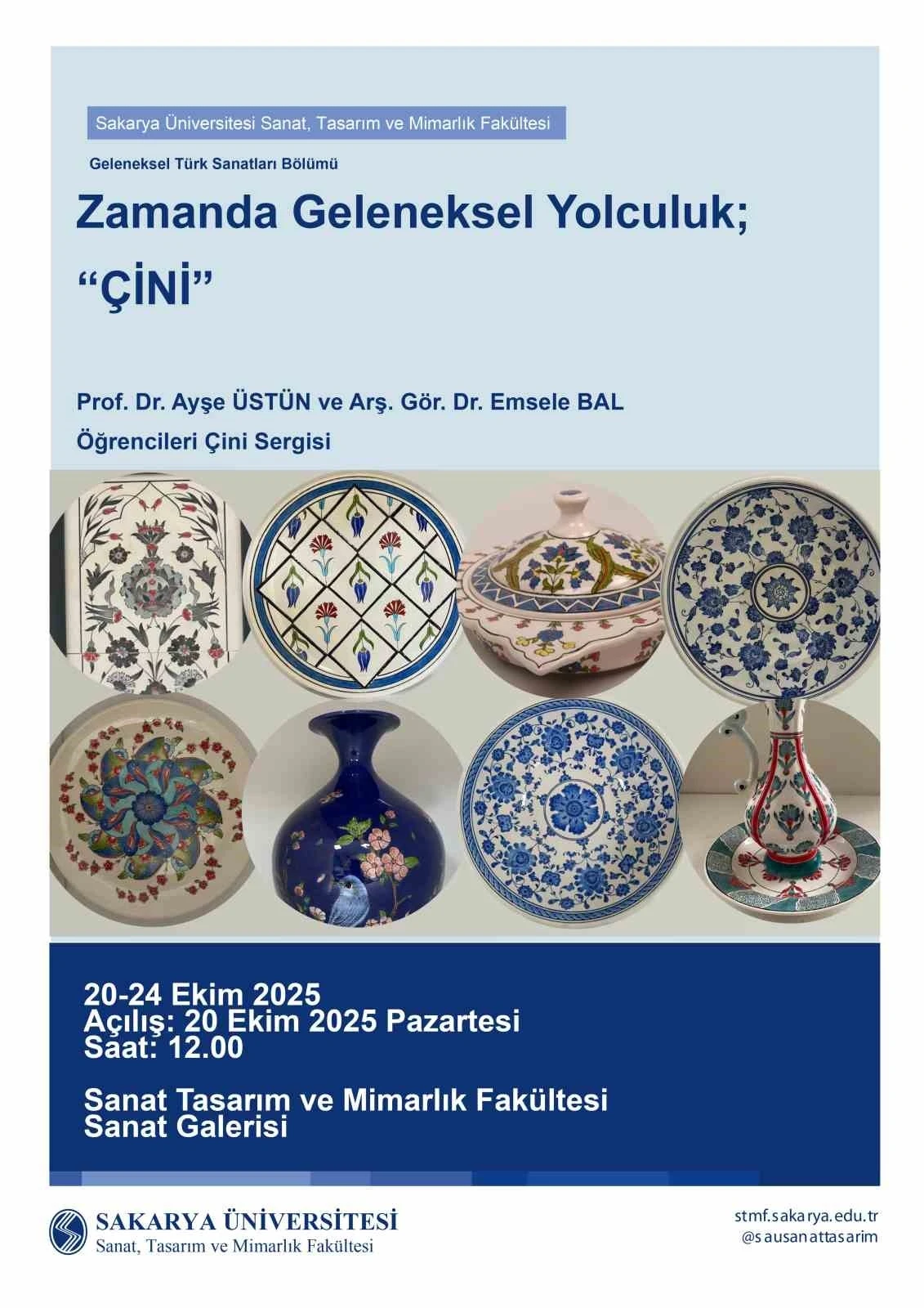 Sakarya Üniversitesi Sanat Tasarım ve Mimarlık Fakültesi Geleneksel Türk Sanatları Bölümü Çini Tasarımı ve Onarımı Anasanat Dalı 4. sınıf öğrencilerinin atölye tasarım ve uygulama dersleri çerçevsinde ürettikleri özgün çini eserleri sanatseverlerle buluşuyor. Prof. Dr. Ayşe Üstün ve Arş. Gör. Dr. Emsele Bal koordinatörlüğünde hazırlanan "Zamanda Geleneksel Yolculuk: Çini" başlıklı sergide, geleneksel sanat anlayışıyla şekillendirilmiş çeşitli çini panolar ve evaniler yer alıyor. Öğrencilerden Berra Yıldız, Ebru Altan, Kübra Acar, Melek İrdem, Nuray Arslan, Nuray Kalay ve Serap Akgöl Aydın’ın çalışmalarından oluşan sergi, çini sanatının tarihsel birikimini çağdaş tasarım yaklaşımıyla yeniden yorumlayarak izleyiciyle buluşturmayı amaçlıyor.