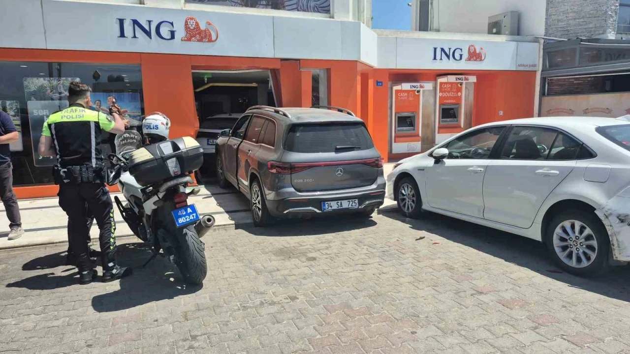 Muğla’nın Bodrum ilçesinde park halindeki otomobile çarpan cip, otomobili bankanın içerisine soktu.