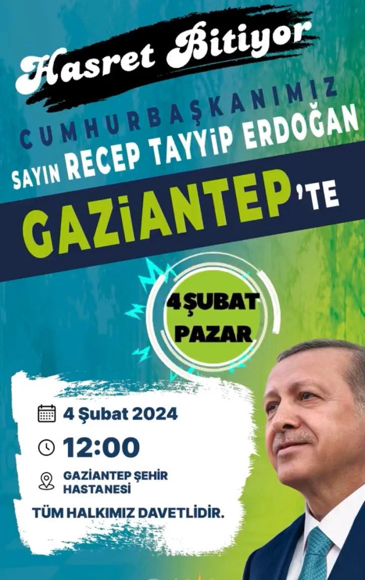 6 Şubat depremlerinin yıldönümünde bölge illerini ziyaret edecek olan Cumhurbaşkanı Erdoğan 4 Şubat Pazar günü(yarın) Gaziantep’e gelecek. Erdoğan Gaziantep programında Şehir Hastanesi başta olmak üzere toplu açılış törenine katılacak ve miting yapacak