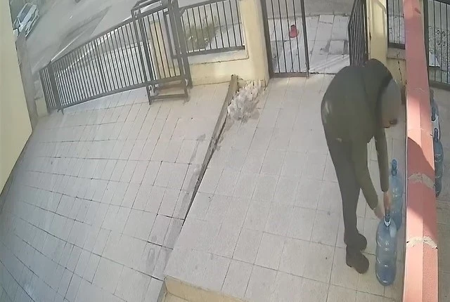 Eskişehir’de bir apartmanın önünde duran damacanaya asılı su parasının çalındığı anlar güvenlik kameralarına yansıdı.