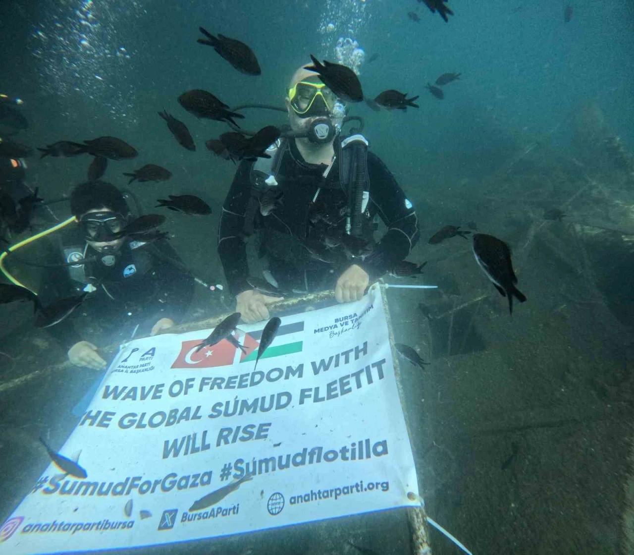 Bursa’da şehit ve gazi yakını bir grup dalış gerçekleştirdikleri deniz altından İsrail zulmü altındaki Filistin halkı ve Gazze yolunda ilerleyen Küresel Sumud filosuna destek verdi.