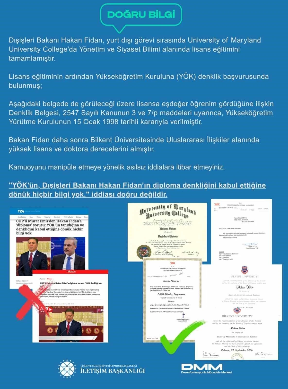 İletişim Başkanlığı Dezenformasyonla Mücadele Merkezi, "Dışişleri Bakanı Hakan Fidan, yurt dışı görevi sırasında University of Maryland University College’da Yönetim ve Siyaset Bilimi alanında lisans eğitimini tamamlamıştır. Lisans eğitiminin ardından Yükseköğretim Kuruluna (YÖK) denklik başvurusunda bulunmuş; lisansa eşdeğer öğrenim gördüğüne ilişkin Denklik Belgesi, 2547 Sayılı Kanunun 3 ve 7/p maddeleri uyarınca, Yükseköğretim Yürütme Kurulunun 15 Ocak 1998 tarihli kararıyla verilmiştir" açıklamasını yaptı.
