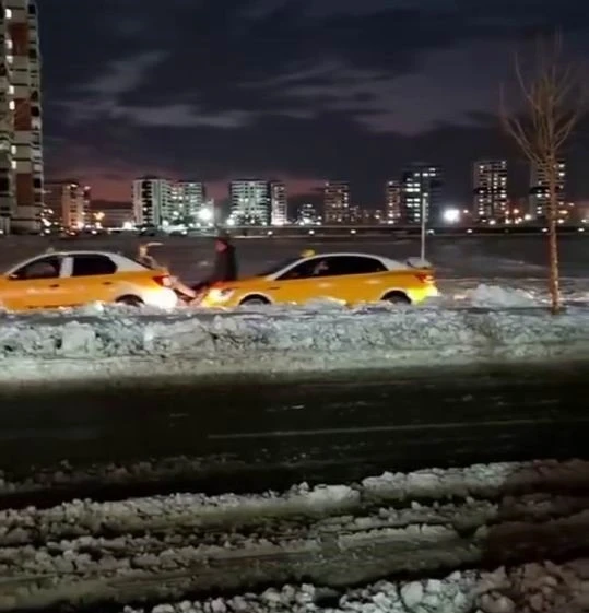 Diyarbakır’da yolda kalan ticari taksiye, başka bir taksinin kaputuna çıkan vatandaş tarafından yardım edildi. O anlar cep telefonu kamerasına yansıdı.