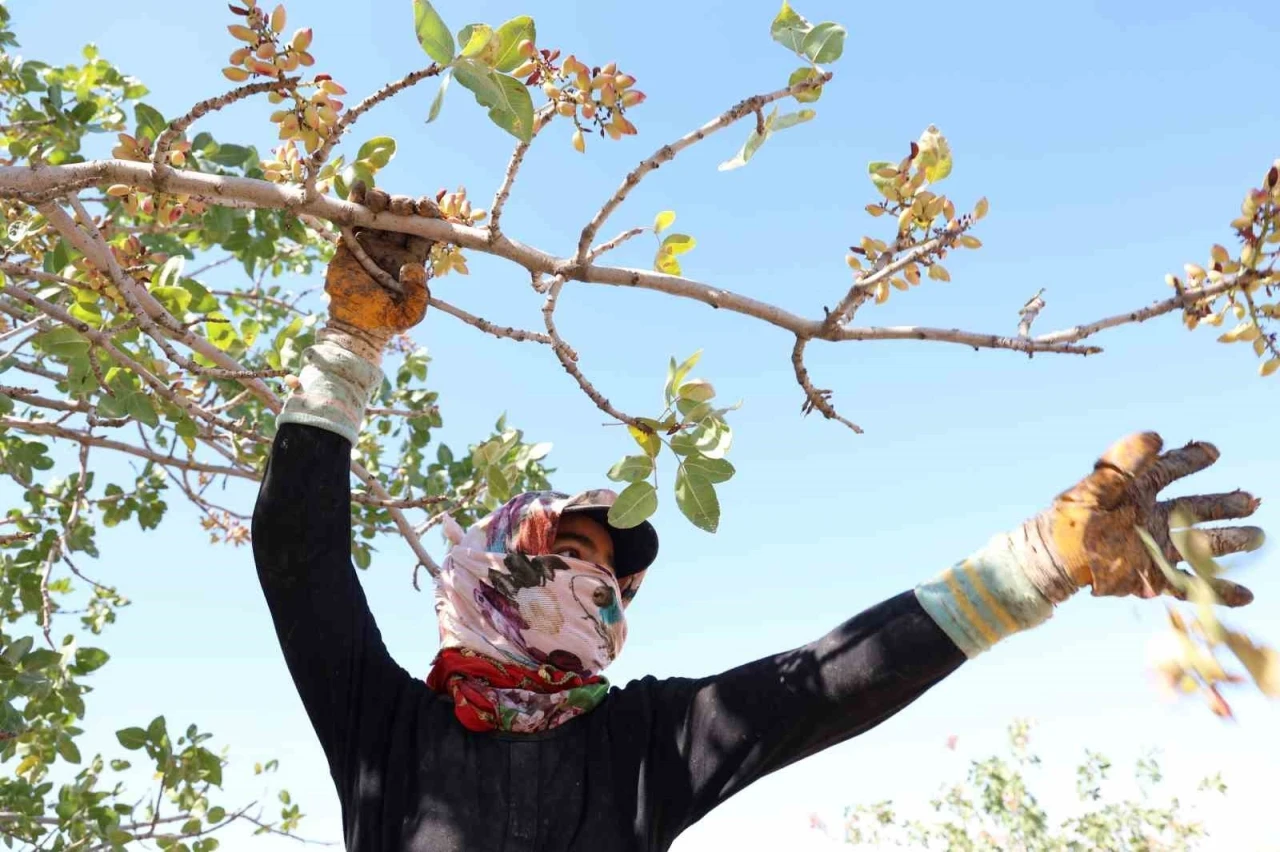 Diyarbakır’ın Çınar ilçesinde mevsimlik işçilerin mevsim normalleri üzerinde seyreden sıcak havada fıstık hasadı devam ediyor.