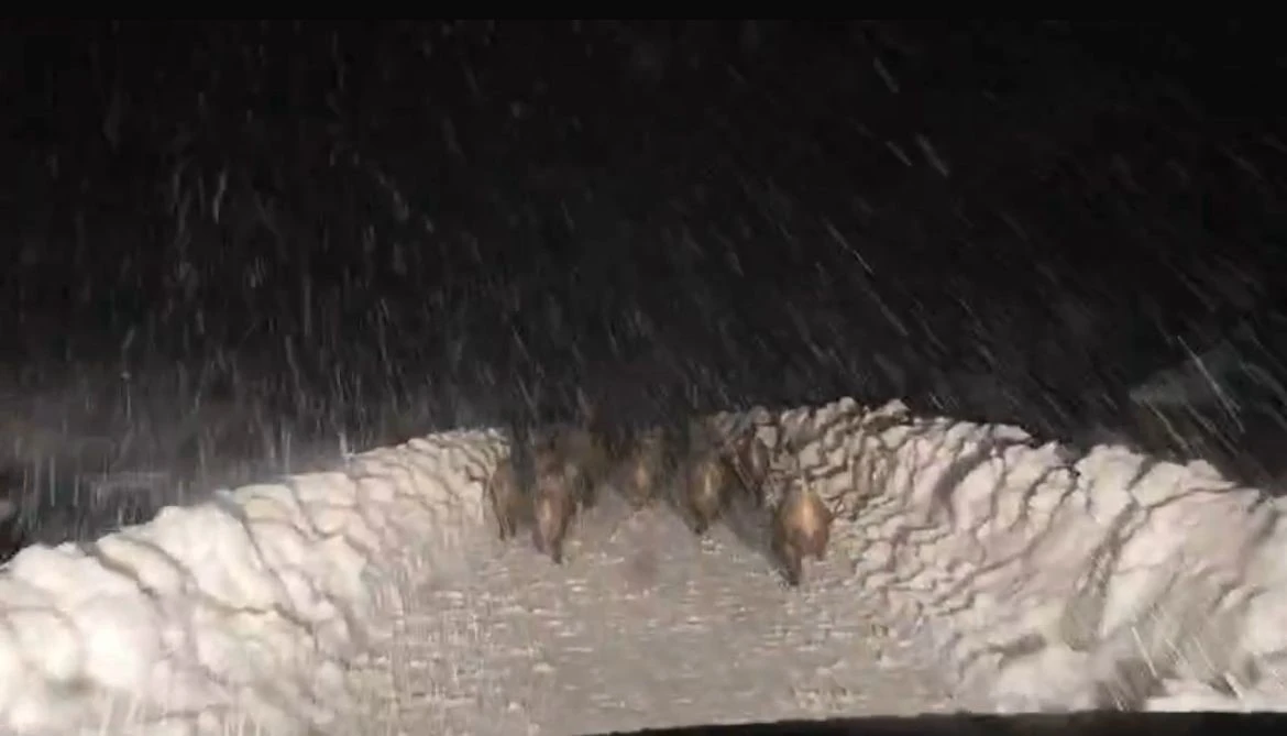 İl Özel İdaresi ekiplerinin Çeltikyolu köyünde karla mücadele çalışmaları sırasında yolda ilerleyen yaban domuzu sürüsü görüldü. O anlar cep telefonu kamerasıyla kaydedildi. Görüntüde, sürücünün karlı yolda koşarak ilerleyen domuzlara "yol verin" diye seslenmesi de yer aldı.