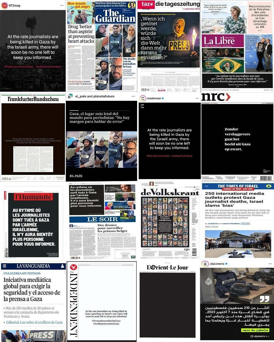 Dünya genelinde 70'i aşkın ülkeden 250'den fazla medya kuruluşu, israil'in gazze şeridi'nde basın mensuplarını öldürmesini protesto etmek amacıyla eş zamanlı olarak gazetelerinin ilk sayfaları ile web sitelerinin ana sayfalarını kararttı ve yayın durdurdu.
