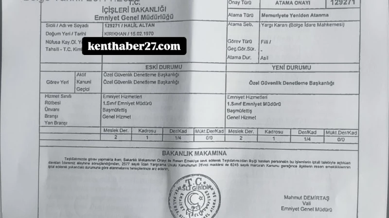 Bir dönem Gaziantep Polis Meslek Yüksek Okulu Müdürlüğü ve İl Emniyet Müdürlüğü kadrosunda çeşitli görevlerde bulunan, Isparta İl Emniyet Müdürü olarak 2015-2016 yıllarında Fetö ile mücadelede adını duyuran ve Türkiye genelinde en başarılı ilk dört il arasında yer almasını sağlayan 1. Sınıf Emniyet Müdürü Halil Altan, hukuk mücadelesini kazanarak görevine iade edildi.