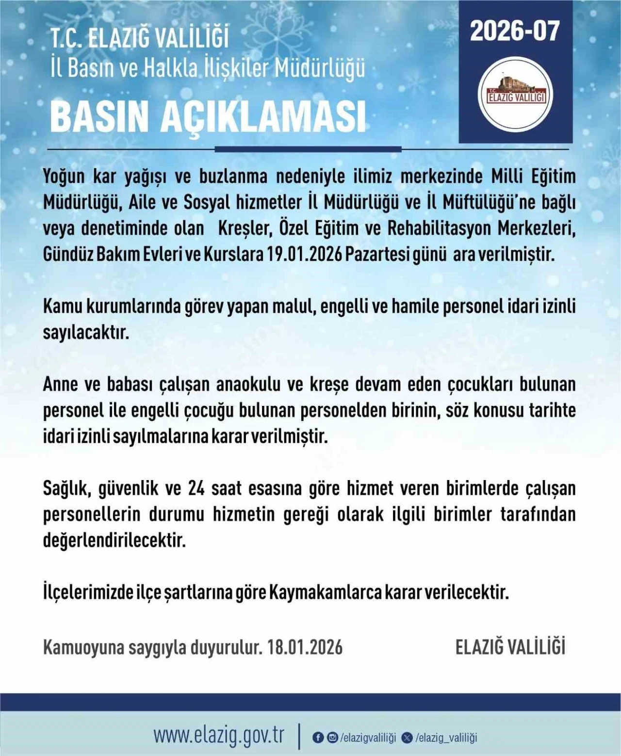 Elazığ Valiliği’nden yapılan açıklamada, "Yoğun kar yağışı ve buzlanma nedeniyle ilimiz merkezinde Milli Eğitim Müdürlüğü, Aile ve Sosyal hizmetler İl Müdürlüğü ve İl Müftülüğü’ne bağlı veya denetiminde olan kreşler, özel eğitim ve rehabilitasyon merkezleri, gündüz bakım evleri ve kurslara Pazartesi günü ara verilmiştir. Kamu kurumlarında görev yapan malul, engelli ve hamile personel idari izinli sayılacaktır. Anne ve babası çalışan anaokulu ve kreşe devam eden çocukları bulunan personel ile engelli çocuğu bulunan personelden birinin, söz konusu tarihte idari izinli sayılmalarına karar verilmiştir. Sağlık, güvenlik ve 24 saat esasına göre hizmet veren birimlerde çalışan personellerin durumu hizmetin gereği olarak ilgili birimler tarafından değerlendirilecek. İlçelerde ise Kaymakamlar tarafından karar verilecektir" denildi.