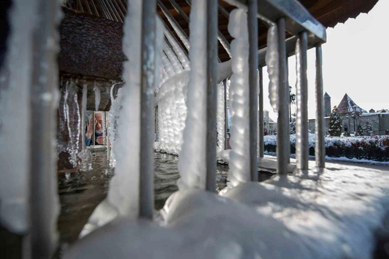 Erzurum’da kar yağışı sonrası soğuk havalar tekrar etkili olmaya başladı. Kent merkezinde şadırvan ve çeşmeler dondu.