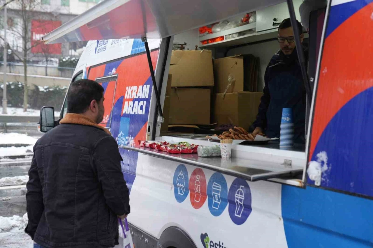 Esenler Belediyesi Halkla İlişkiler ekipleri, etkili olan kar yağışı nedeniyle ilçenin yoğun noktalarında vatandaşlara çeşitli ikramlarda bulundu. İstanbul Valiliği ile koordinasyon içinde gerçekleştirilen çalışmalar kapsamında, sabah saatlerinden itibaren işe giden, trafikte beklemek zorunda kalan ve gün içinde dışarıda bulunan vatandaşlara hizmet veren ESTİM İkram Aracı ile 5 bin kişiye ulaşıldı. Vatandaşlara sunulan sıcak ve soğuk ikramlarla kar yağışının etkili olduğu kış günlerinde yaşanan zor şartlara destek olundu. "Vatandaşlarımızın yanındayız"