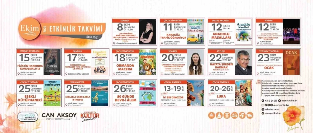 Esenyurt Belediyesi, ekim ayı için kültür, sanat ve eğitim etkinlikleriyle dolu dolu bir program hazırladı. Her yaş grubuna hitap eden etkinlik takvimi; seminerlerden çocuk tiyatrolarına, şiir etkinliklerinden sinema gösterimlerine kadar birçok farklı içeriği kapsıyor.