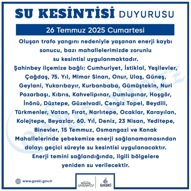 “Oluşan trafo yangını nedeniyle yaşanan enerji kaybı sonucu bazı mahallelerimizde zorunlu su kesintisi uygulanmaktadır. Enerji temini sağlandığında ilgili bölgelere yeniden su verilecektir. Ekiplerimiz süreci yakından takip etmektedir. Anlayışınız için teşekkür ederiz.”