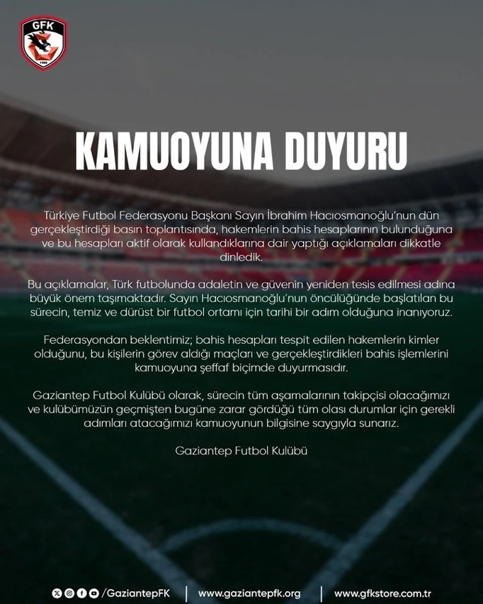 Gaziantep Futbol Kulübü, konuyla ilgili yaptığı yazılı açıklamada, Hacıosmanoğlu’nun başlattığı sürecin Türk futbolunda adalet ve güvenin yeniden tesis edilmesi adına tarihi bir adım olduğunu vurguladı.