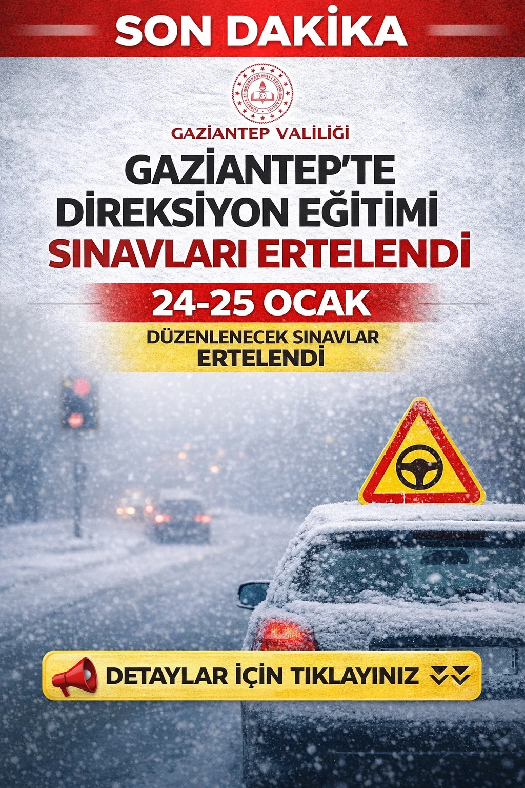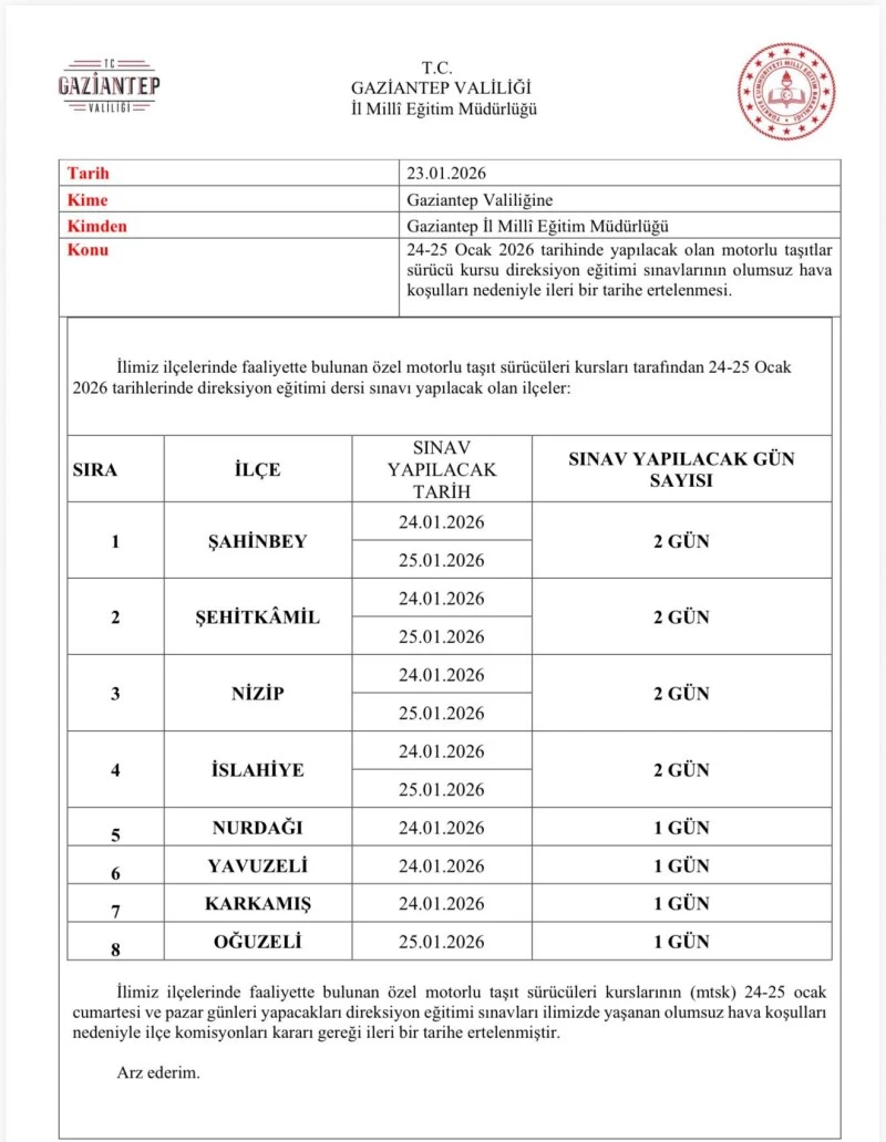 Gaziantep İl Milli Eğitim Müdürlüğü tarafından Valiliğe sunulan yazıya göre, erteleme kararı ilçe komisyonlarının değerlendirmesi sonucunda alındı. Kararın, sürücü adaylarının ve görevli personelin güvenliği dikkate alınarak verildiği vurgulandı.