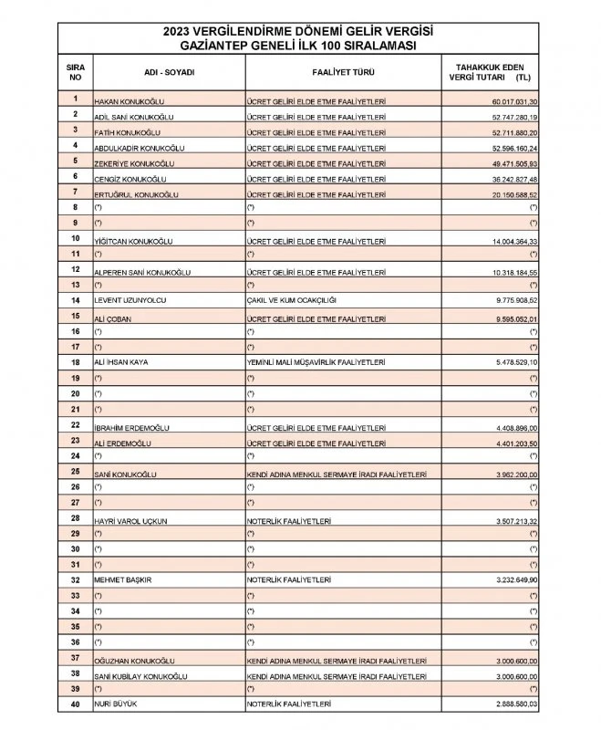 Gaziantep Defterdarlığı web sayfasında yayınlanan gelir vergisi rekortmenleri listesinde ilk 7 sırayı Hakan Konukoğlu, Adil Konukoğlu, Fatih Konukoğlu, Abdulkadir Konukoğlu, Zekeriye Konukoğlu, Cengiz Konukoğlu ve Ertuğrul Konukoğlu alırken, Yiğitcan Konukoğlu 10’uncu sıradan, Alperen Sani Konukoğlu 12’nci sıradan, Sani Konukoğlu 25’inci sıradan, Oğuzhan Konukoğlu 37’nci sıradan ve Sani Kubilay Konukoğlu 38’inci sıradan listeye girmeyi başardı. Bu başarı, ailenin vergi rekortmenliği geleneğinin sürdüğünü ve Gaziantep ekonomisine yaptıkları katkının devam ettiğini gösteriyor.