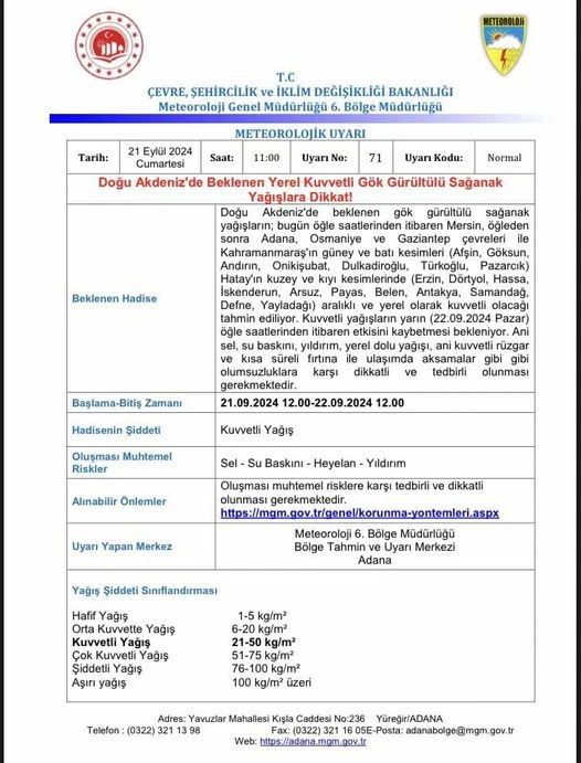 Meteoroloji Genel Müdürlüğü tarafından yapılan açıklamada, yağışların özellikle Osmaniye, Adana ve Gaziantep çevresinde etkili olacağı belirtildi. Vatandaşların su baskınlarına karşı tedbirli olmaları ve mümkünse dışarıda vakit geçirmemeleri tavsiye ediliyor.