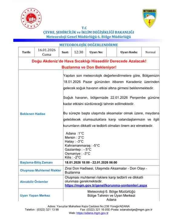 Açıklamaya göre, olumsuz hava koşullarının 18 Ocak 2026 Pazar günü saat 18.00’den itibaren başlayacağı ve 22 Ocak 2026 Perşembe günü saat 06.00’ya kadar aralıklarla etkisini sürdüreceği tahmin ediliyor. Bu süreçte yer yer kar yağışının görülebileceği, özellikle gece ve sabah saatlerinde buzlanma ile don olaylarının artabileceği bildirildi.