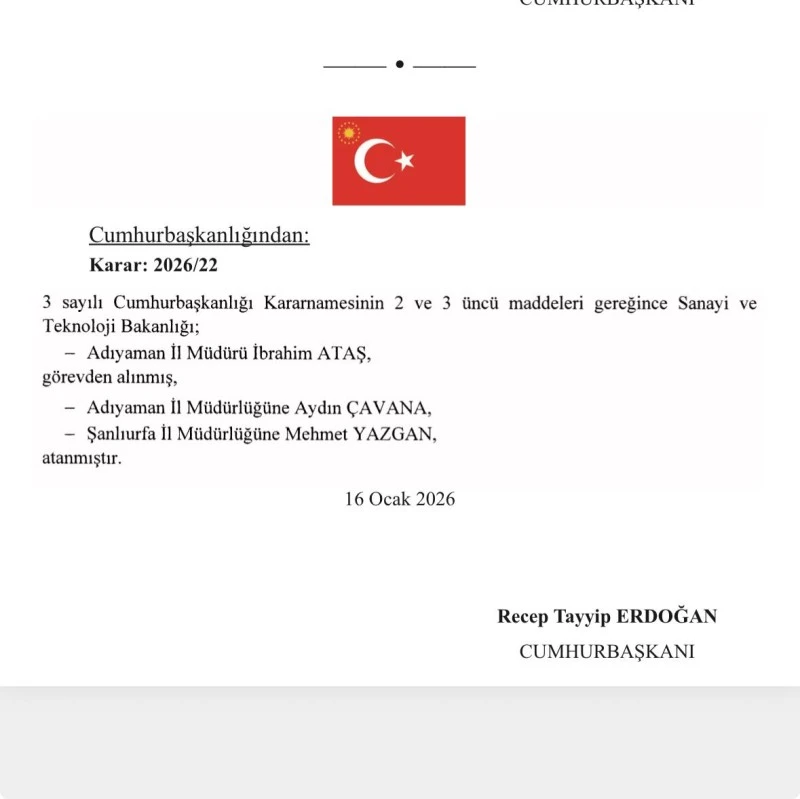 Cumhurbaşkanlığı kararına göre, Adıyaman Sanayi ve Teknoloji İl Müdürü İbrahim Ataş görevden alınırken, Adıyaman İl Müdürlüğü’ne Aydın Çavana, Şanlıurfa İl Müdürlüğü’ne ise Mehmet Yazgan görevlendirildi.