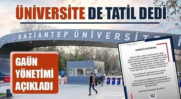 “Meteorolojik veriler, ilimizde devam eden olumsuz hava koşullarının 2 Ocak tarihinde de etkisini südüreceğini, hava sicaklıklarının düşük seyredeceğini ve buzlanma riskinin yüksek olacağını göstermektedir. Bu kapsamda, Üniversitemizde eğitim-öğretim faaliyetlerine 2 Ocak tarihinde 1 gün süreyle ara verilmiştir. Aynı tarihte özel gereksinimli ve hamile personelimiz idari izinli sayılacaktır. Final sınavlarıina ilişkin güncel takvim ve uygulamalara dair bilgilendirme, ilgili akademik birimlerimizin web sayfaları Üzerinden ayrica duyurulacaktir. Kamuoyuna saygıyla duyurulur.”
