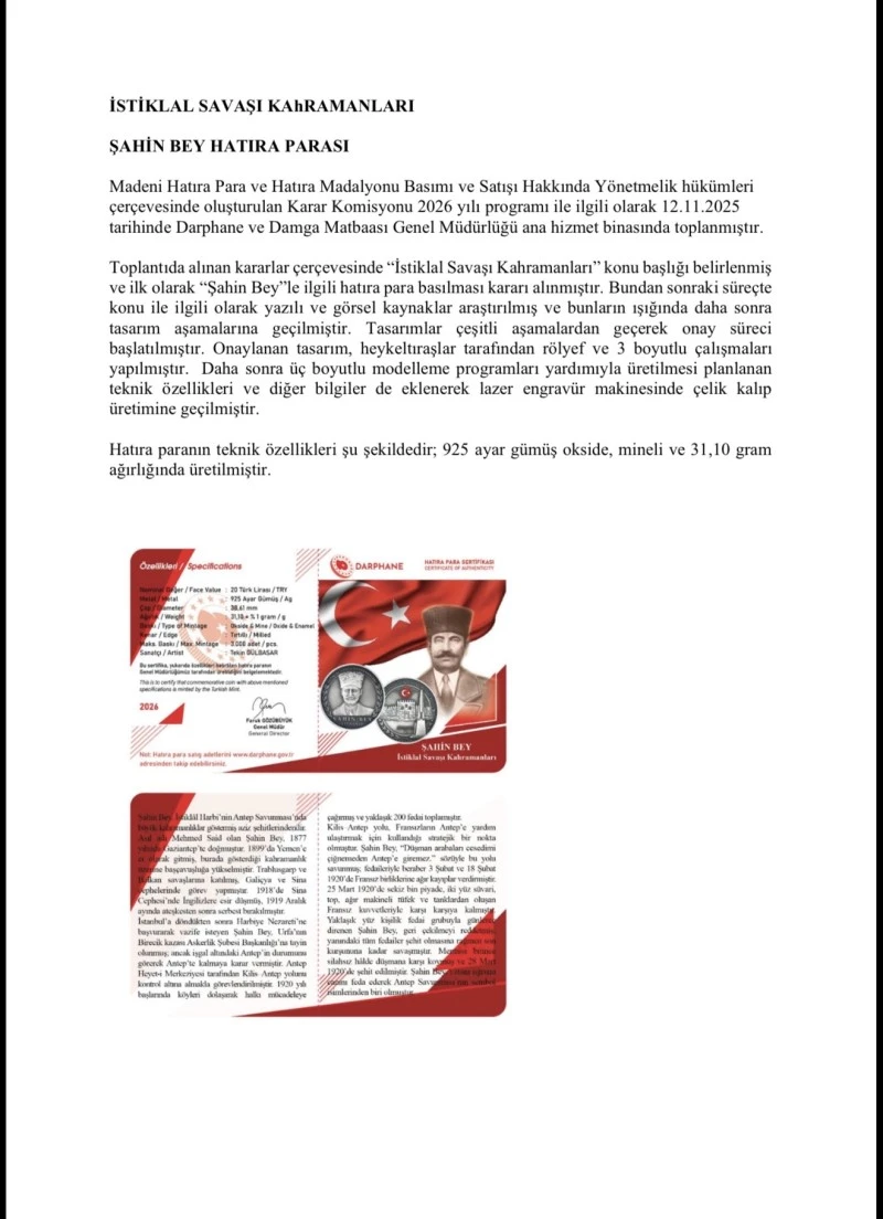 “Bu destansı mücadelenin yeniden hatırlanması ve genç nesillere aktarılmasına katkı sunmak amacıyla, Hatıra Para Kurulumuzun kararıyla Milli Mücadele kahramanımız Şahinbey’in hatıra parası hazırlanmıştır. Bu vesileyle tüm şehitlerimize Allah’tan rahmet diliyor, ruhlarının şad olmasını temenni ediyorum.”