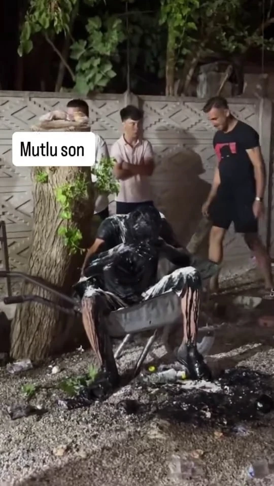 Akyazı ilçesi Çatalköprü Mahallesi’nde bir grup arkadaşın gelenek haline getirdiği yumurtalı, sulu düğün eğlencesi, bu kez farklı bir boyuta taşındı. Geçtiğimiz hafta sonu bir kişi, 5 litrelik bidon içinde getirdiği motor yağını dökerek damadı adeta siyaha boyadı. Daha sonrasında ise damadın başına sirke, ketçap, su ve ayçiçeği yağı aktarıldı. Adeta eziyete dönüşen eğlence cep telefonu ile kaydedildi.