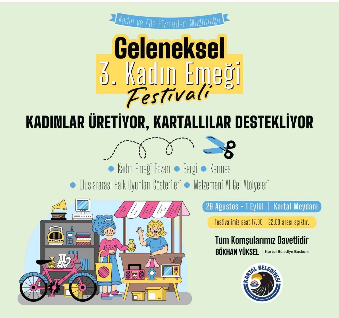 Kartal belediyesi, kartallı kadınların el emeği göz nuru ürünlerinin üretimine destek olup sergilemesine imkan sağlamak amacıyla düzenlediği geleneksel 3'üncü kadın emeği festivali, 29 ağustos-1 eylül tarihlerinde ziyaretçilerini ağırlayacak.