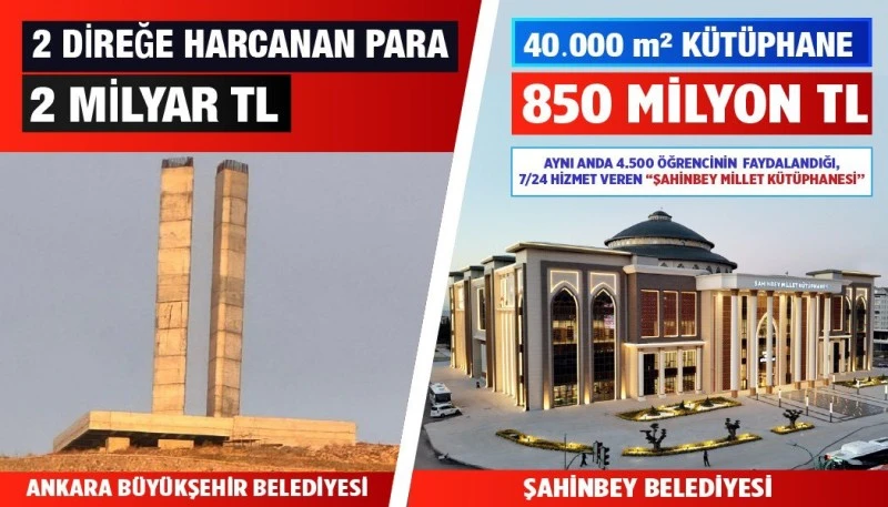 Gökçek paylaşımında, Şahinbey Belediye Başkanı Mehmet Tahmazoğlu’nun 800 milyon TL’ye kazandırdığı, 40 bin metrekare büyüklüğündeki ve aynı anda 4 bin öğrencinin yararlanabildiği dev kütüphaneyi öne çıkararak Yavaş’ın projelerini hedef aldı.