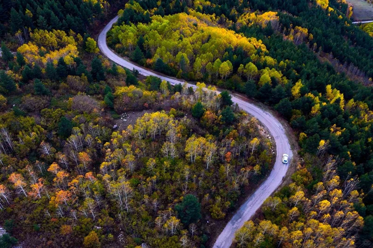 Yol boyunca uzanan titrek kavak ağaçlarının altın sarısı yaprakları, her dem yeşil kalan sarı çam ormanları ve yer yer kendini gösteren meşe ağaçlarının kahverengi tonları, doğanın ne denli zengin bir palete sahip olduğunu gözler önüne seriyor. "Burası enteresan bir yer"