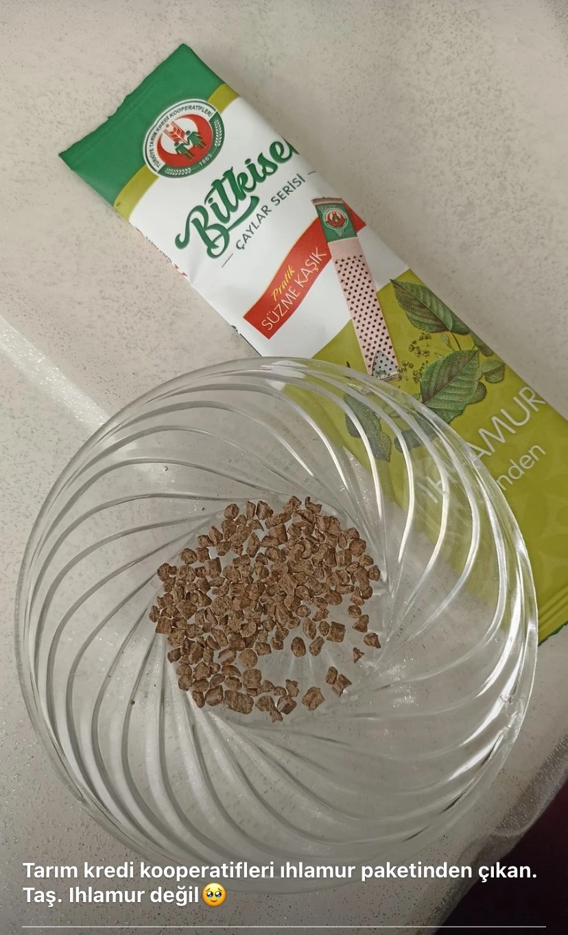 Vatandaş, paket içerisindeki yabancı maddeyi fark edince durumu görüntüleyerek sosyal medyada paylaştı. Paket üzerinde “ıhlamur” ibaresi bulunmasına rağmen, içinden taş çıkması tepkiye neden oldu.
