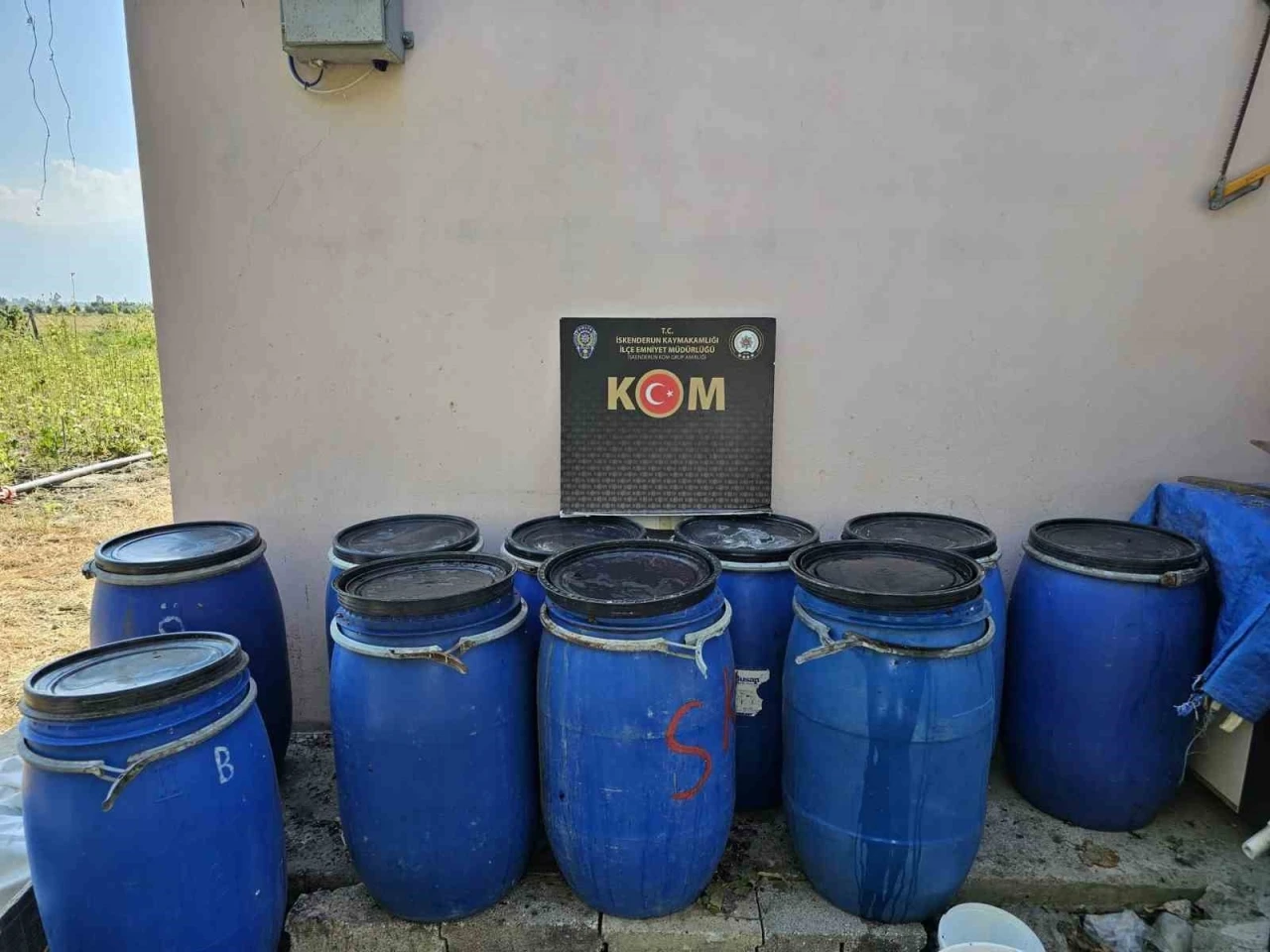Hatay’ın Arsuz ilçesinde belirlenen 3 adreste yapılan aramada bin 35 litre sahte içki ile içki yapımında kullanılan malzemeler ele geçirildi.