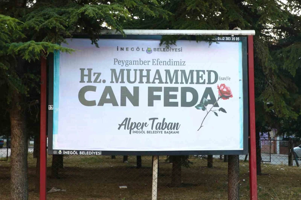 İnegöl Belediyesi, ilçedeki billboardlara "Peygamber Efendimiz Hz. Muhammed’e (SAV) Can Feda" yazılı afişler astırdı.