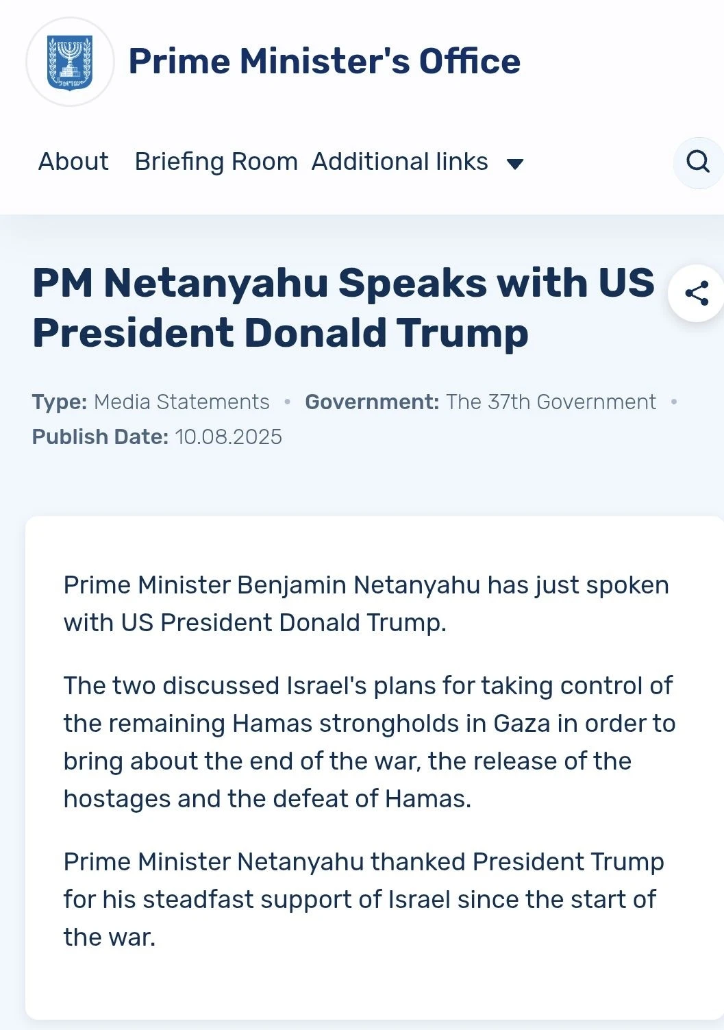 İsrail Başbakanı Binyamin Netanyahu, ABD Başkanı Donald Trump ile yaptığı telefon görüşmesinde İsrail’in Gazze’yi işgal planını ele alarak, İsrail’e verdiği kararlı destekten dolayı Trump’a teşekkür etti.